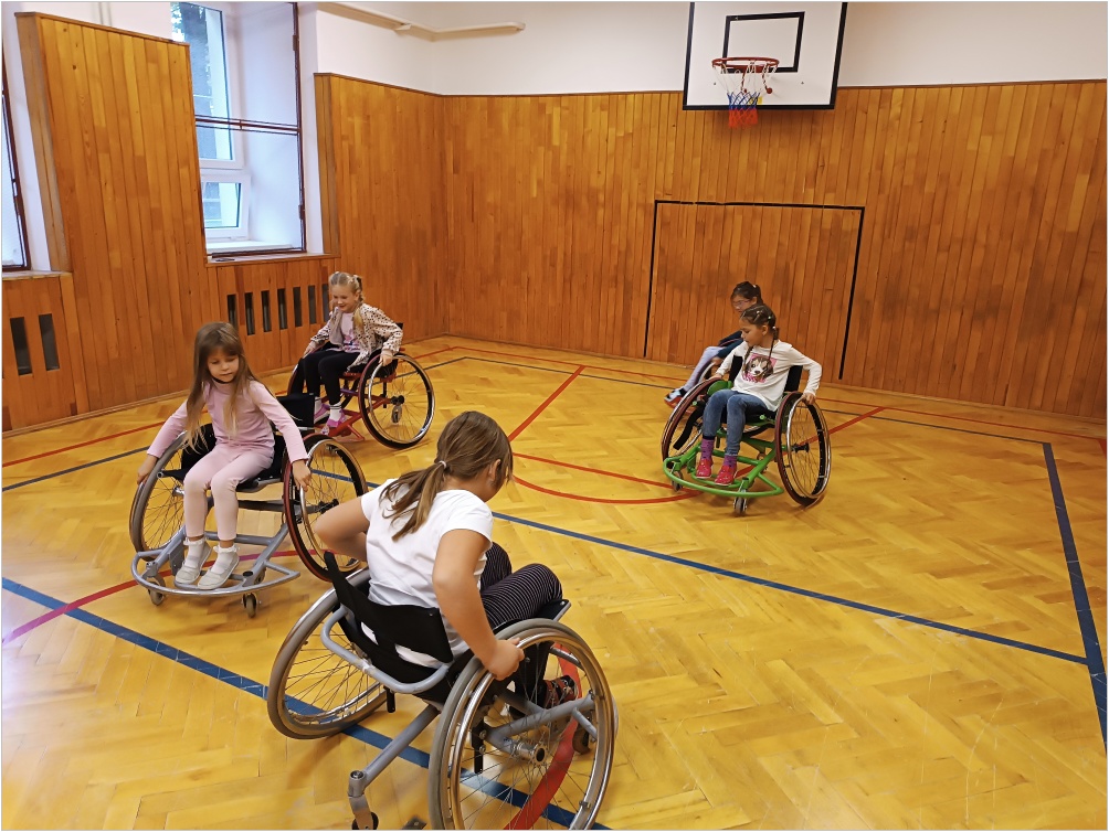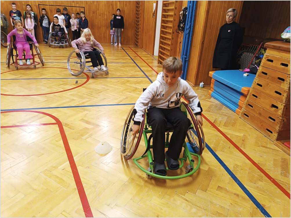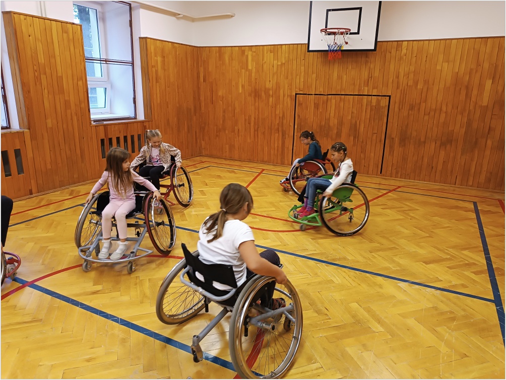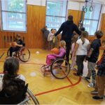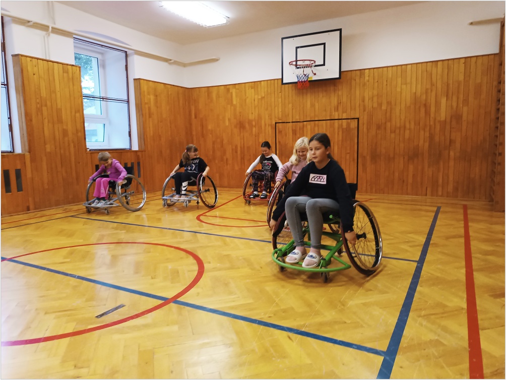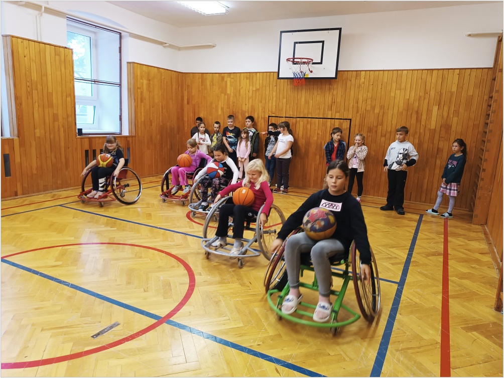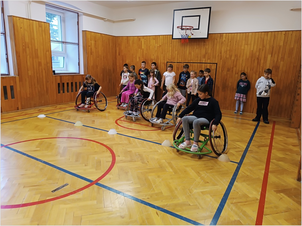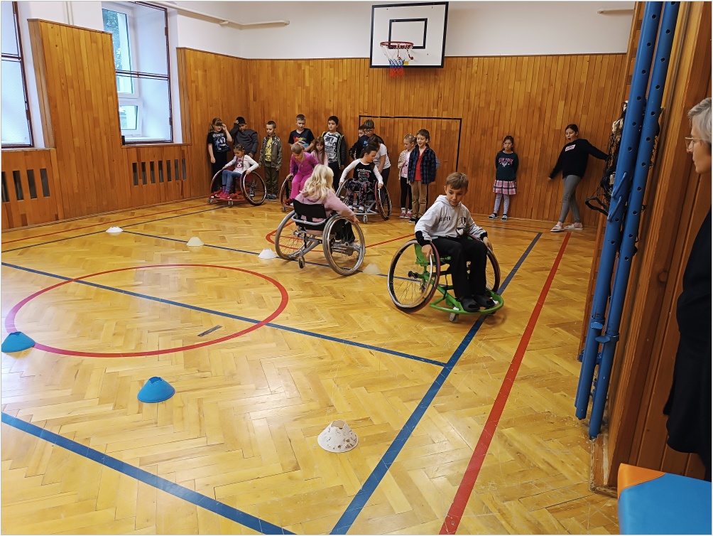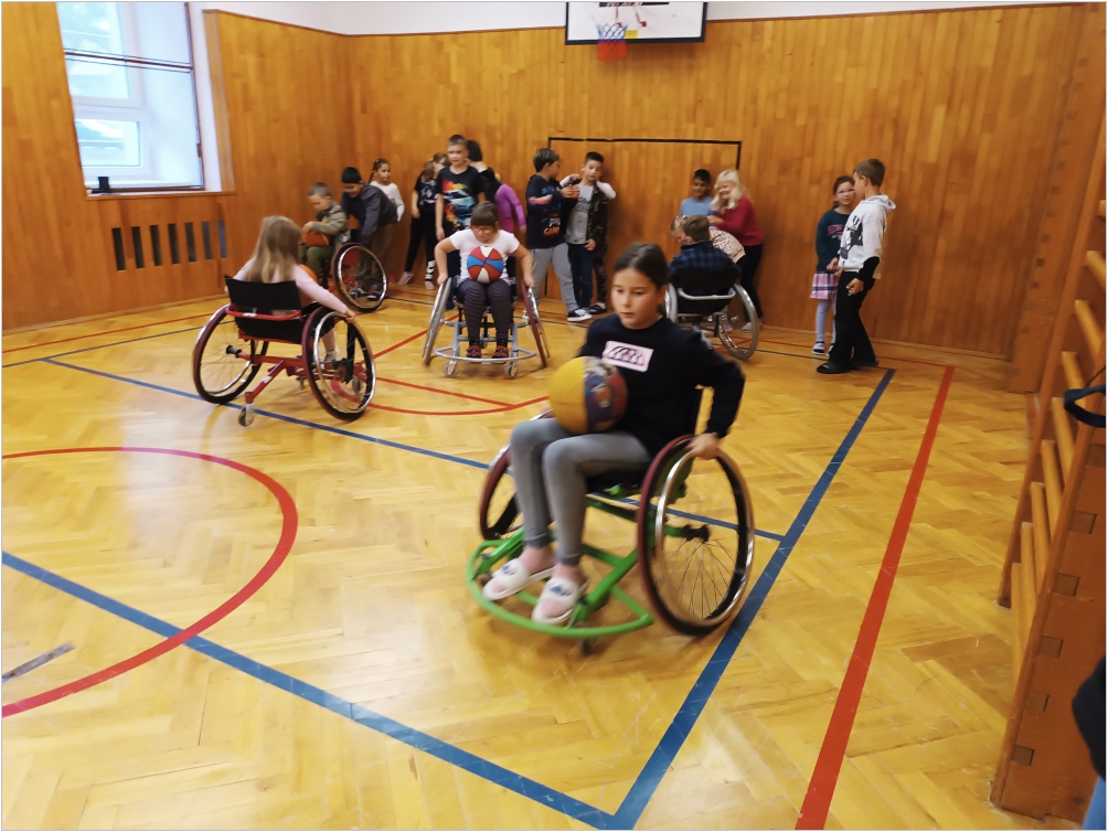 V pondělí nás v MŠ i ZŠ navštívili zástupci z Univerzity Palackého v Olomouci. Žáci základní školy se seznámili s kompenzačními pomůckami, vyzkoušeli si pohyb na vozíčku a dokonce si zahráli basketbal na vozíku. Děti z mateřské školy si procvičily jemnou motoriku při navlékání korálků a zároveň i své hlavičky při počítání a třídění barevných zvířátek do správných mističek. Obě skupiny si dopoledne plné nových zážitků a her velmi užily.