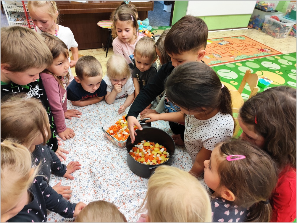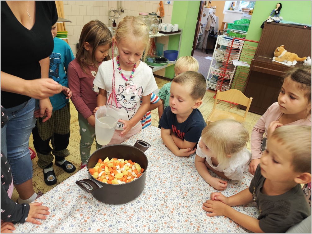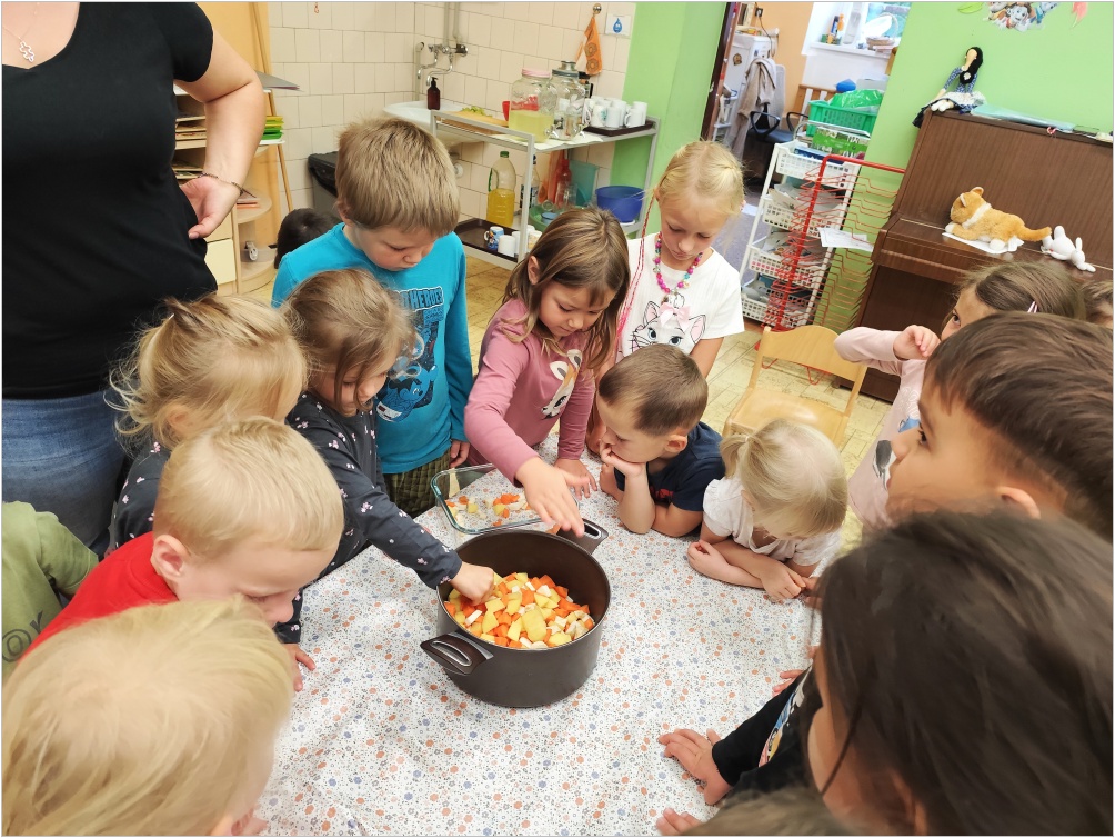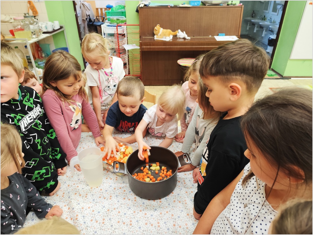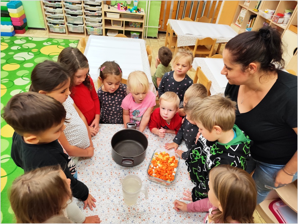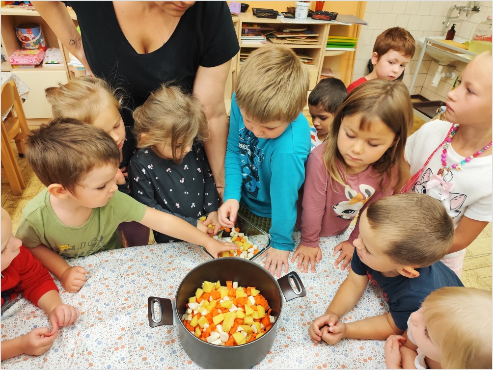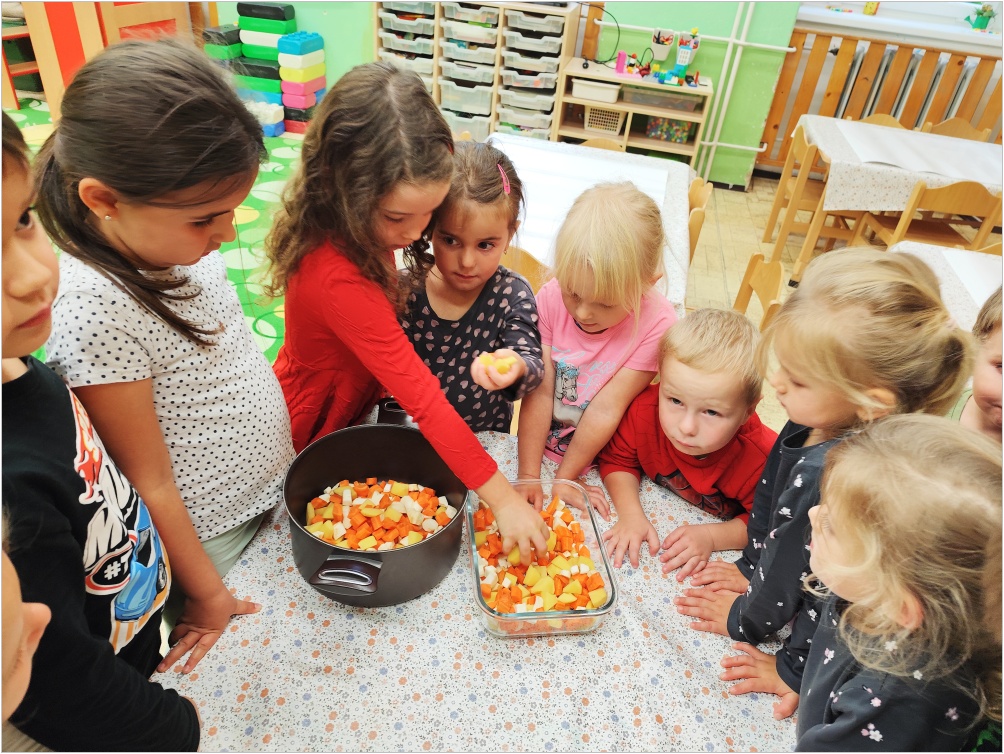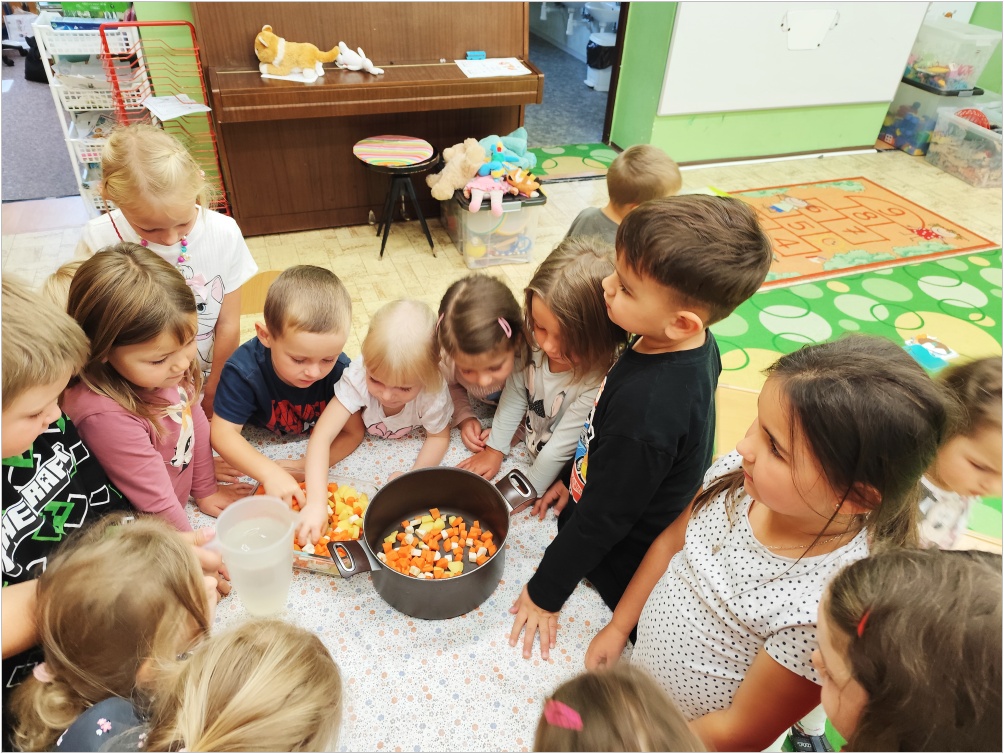 V MŠ se děti seznamovaly s podzimní zeleninou a objevovaly její barvy, tvary a vůně. Společně si ji nakrájely a uvařily z ní výbornou zeleninovou polévku. Než se polévka dovařila, tvořily děti ve skupinkách obrazy pomocí bramborových tiskátek. Zahrály si také veselé hry, při kterých si procvičily barvičky a svou obratnost. Celé dopoledne si všichni moc užili a za odměnu si pochutnali na polévce, která se jim opravdu povedla.