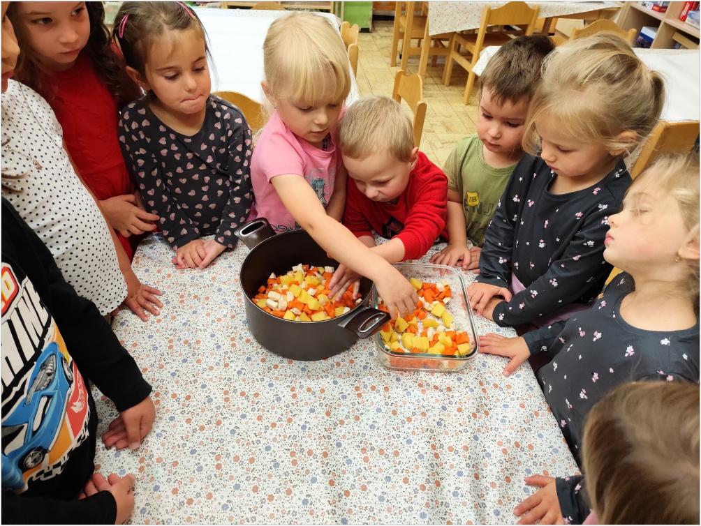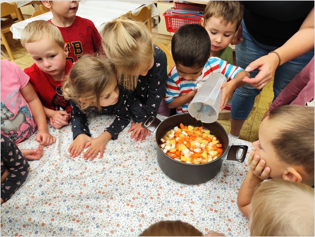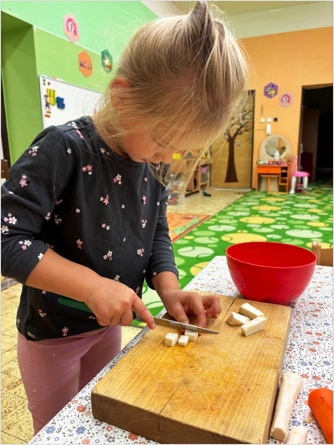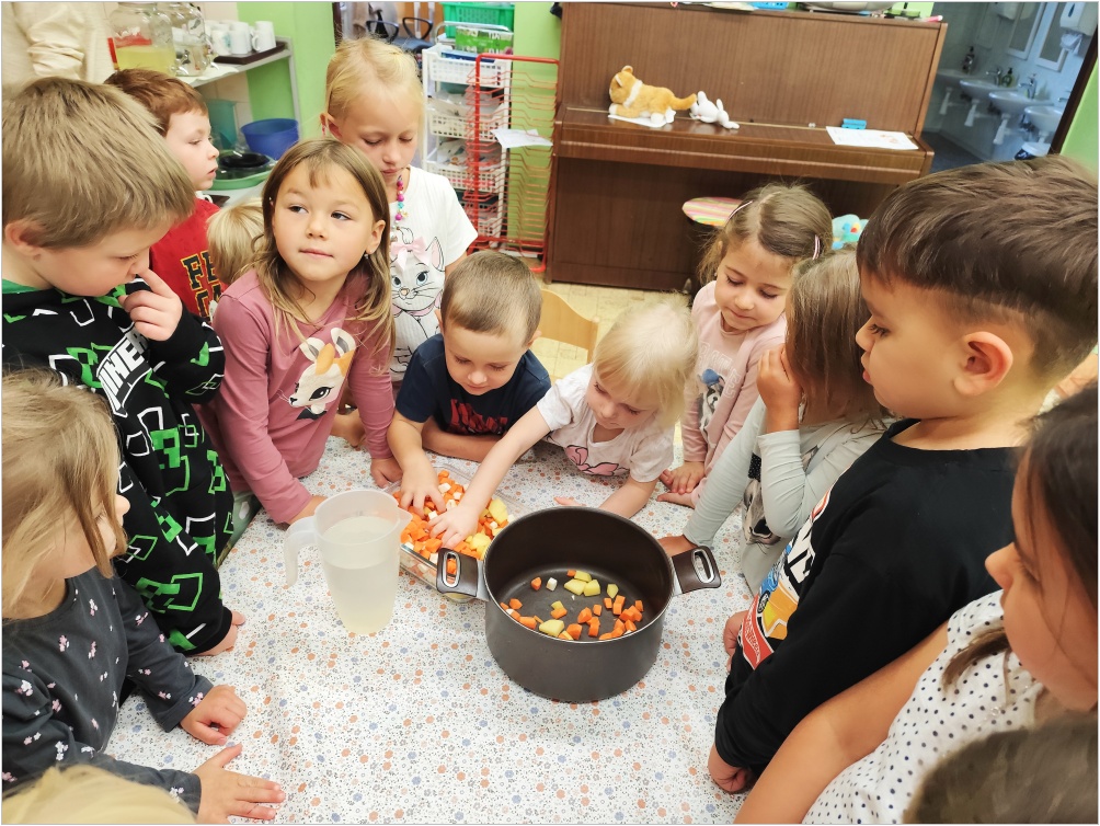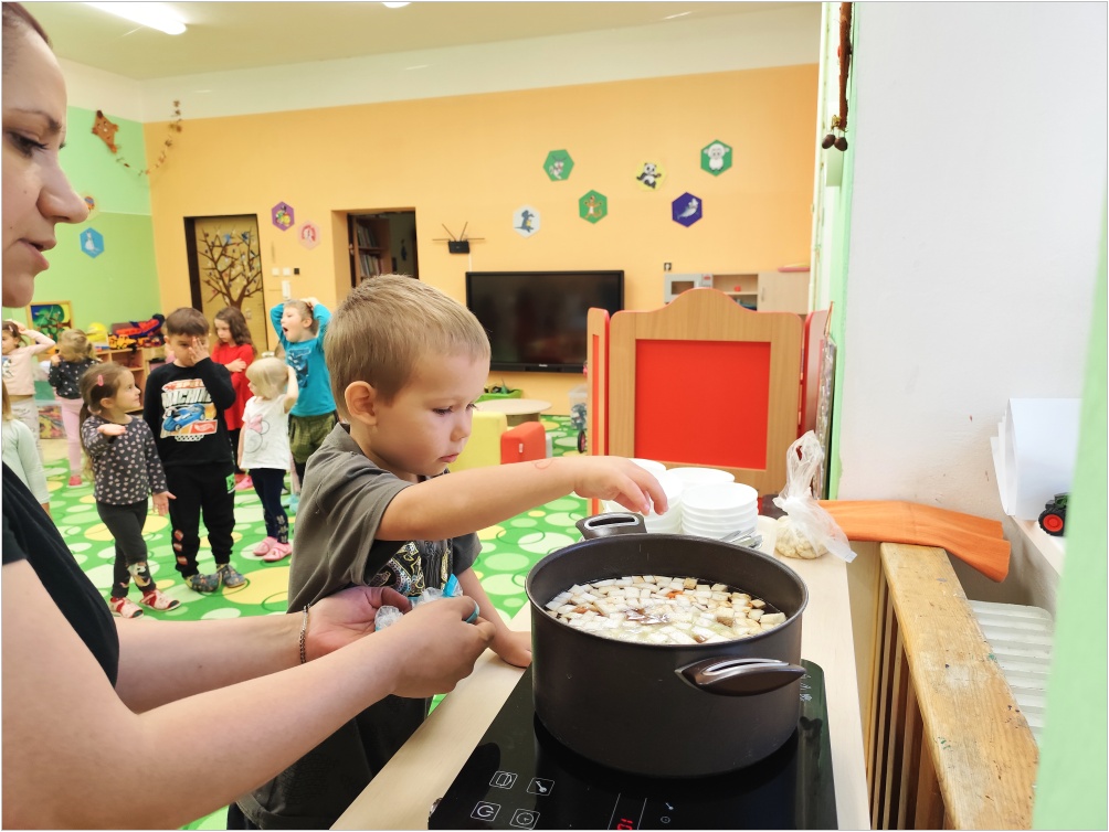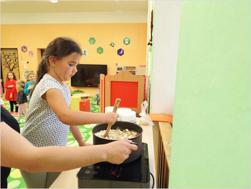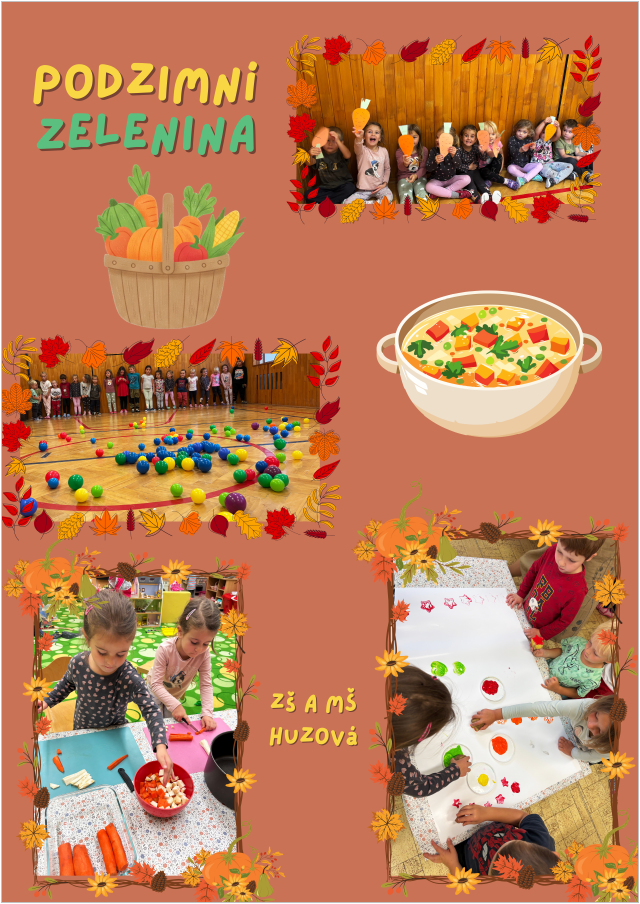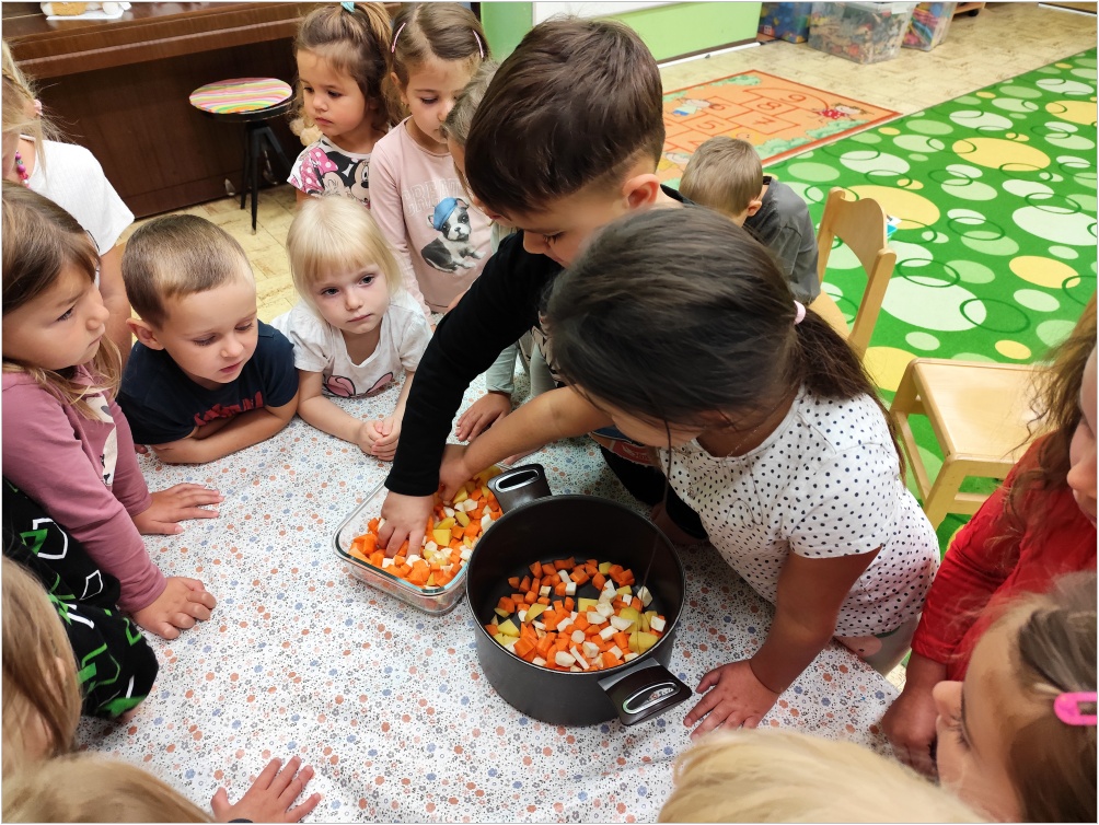 V MŠ se děti seznamovaly s podzimní zeleninou a objevovaly její barvy, tvary a vůně. Společně si ji nakrájely a uvařily z ní výbornou zeleninovou polévku. Než se polévka dovařila, tvořily děti ve skupinkách obrazy pomocí bramborových tiskátek. Zahrály si také veselé hry, při kterých si procvičily barvičky a svou obratnost. Celé dopoledne si všichni moc užili a za odměnu si pochutnali na polévce, která se jim opravdu povedla.