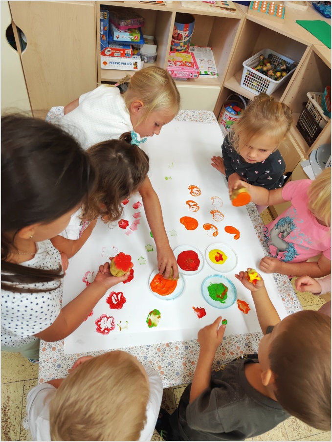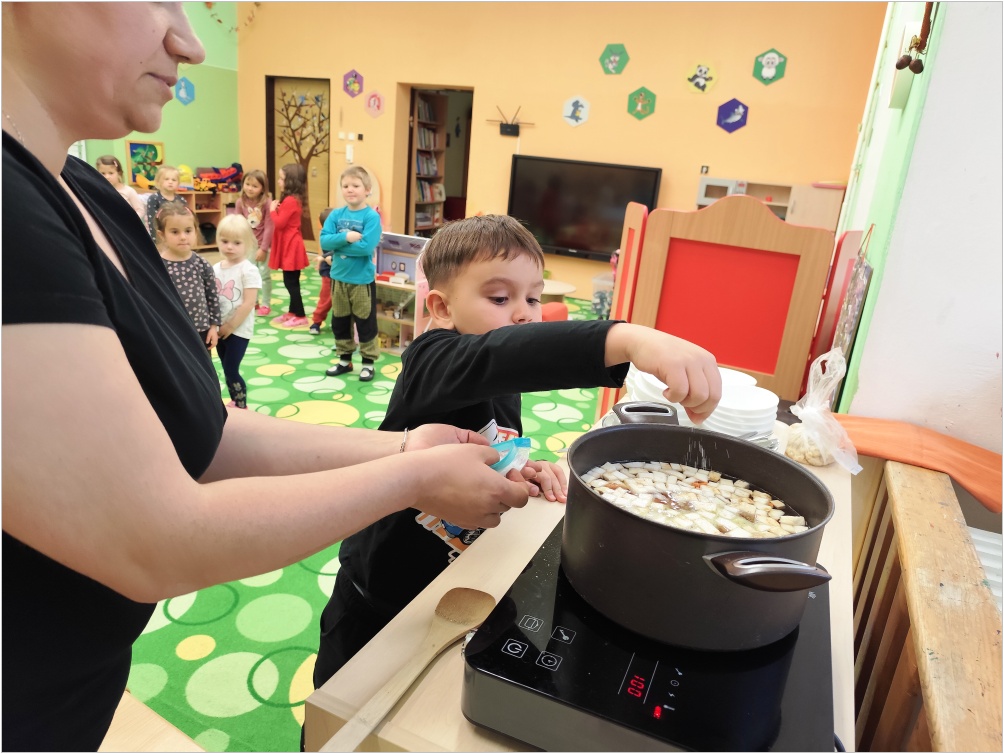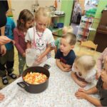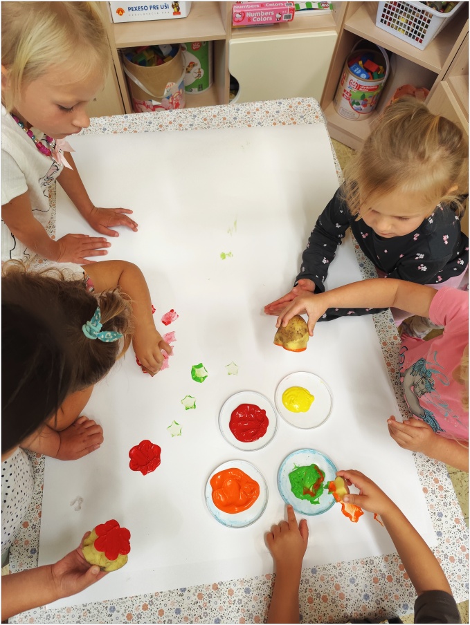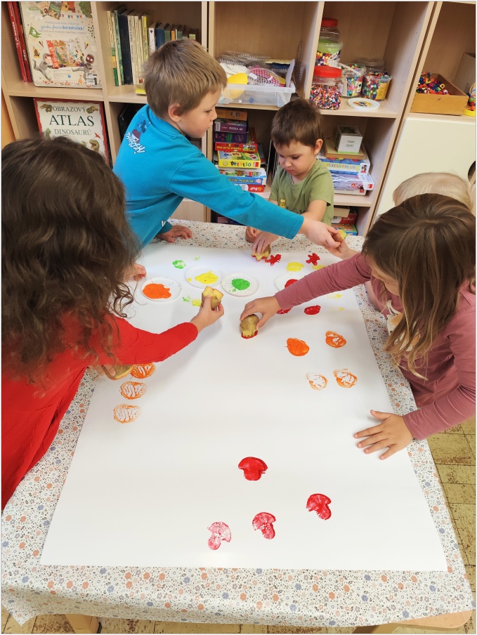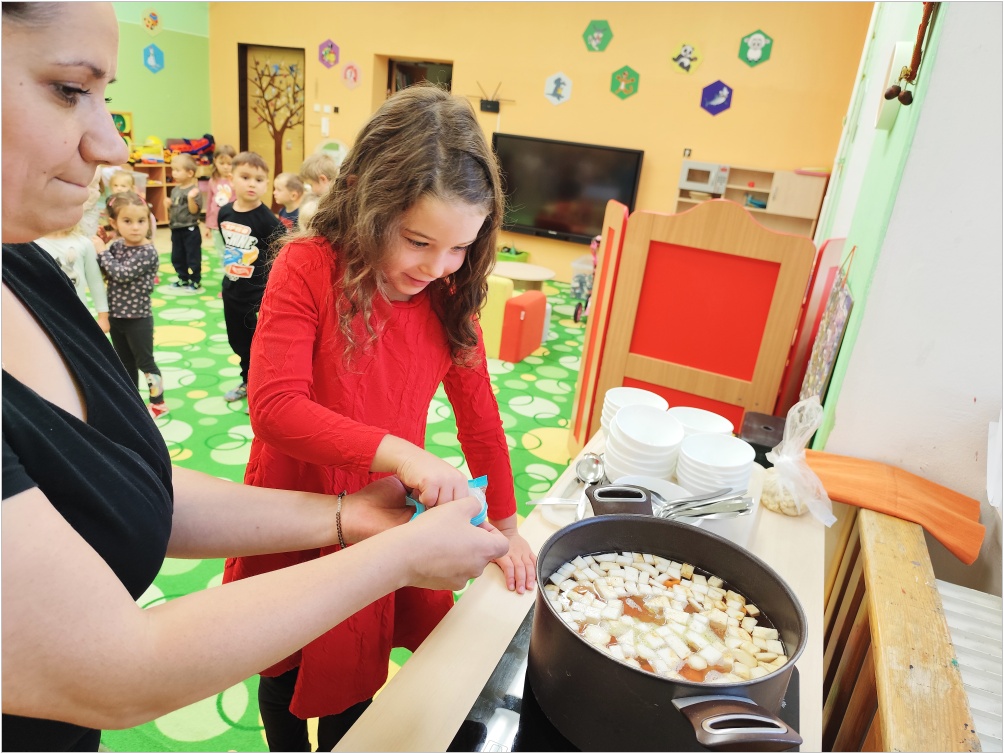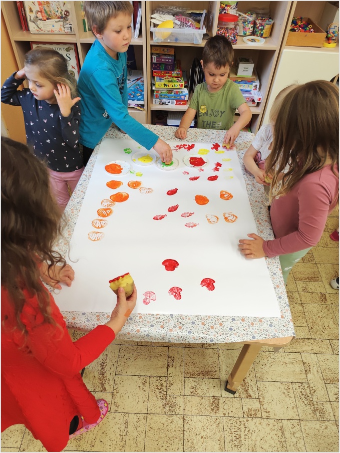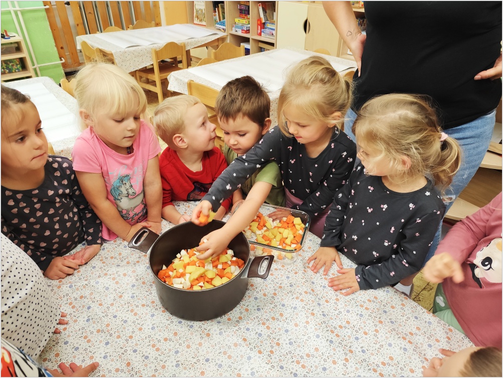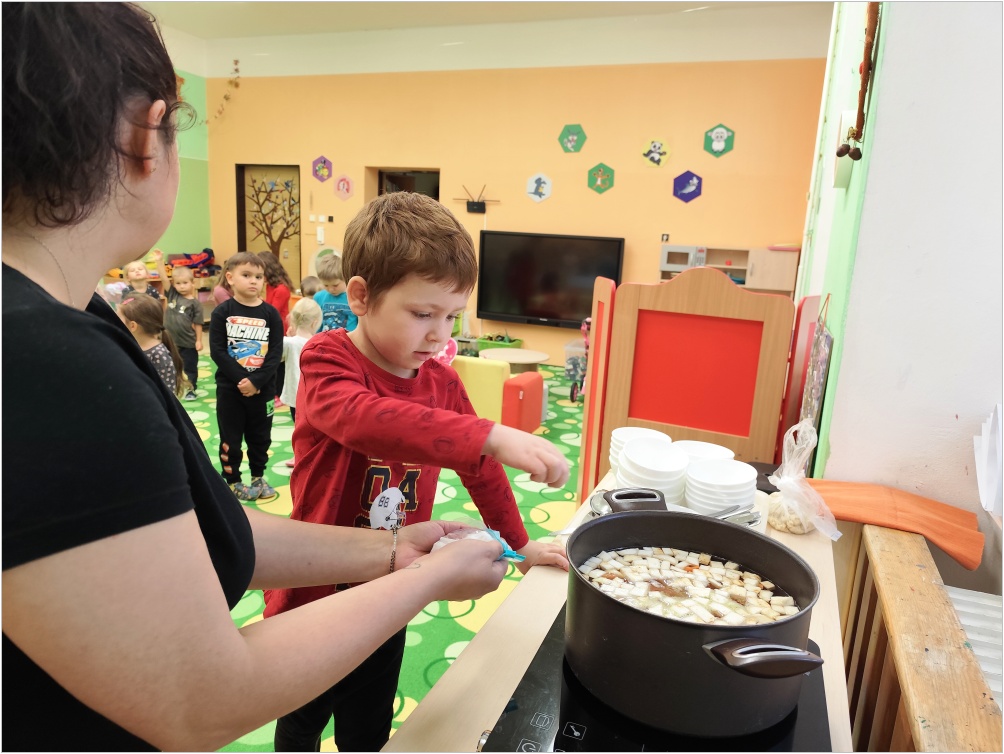 V MŠ se děti seznamovaly s podzimní zeleninou a objevovaly její barvy, tvary a vůně. Společně si ji nakrájely a uvařily z ní výbornou zeleninovou polévku. Než se polévka dovařila, tvořily děti ve skupinkách obrazy pomocí bramborových tiskátek. Zahrály si také veselé hry, při kterých si procvičily barvičky a svou obratnost. Celé dopoledne si všichni moc užili a za odměnu si pochutnali na polévce, která se jim opravdu povedla.