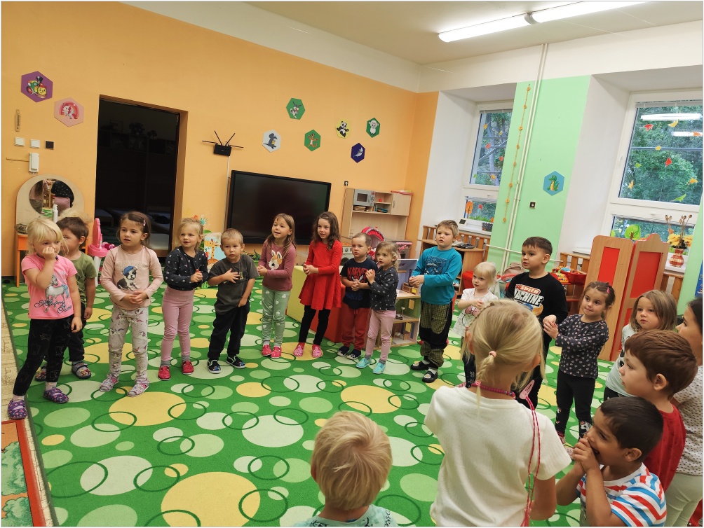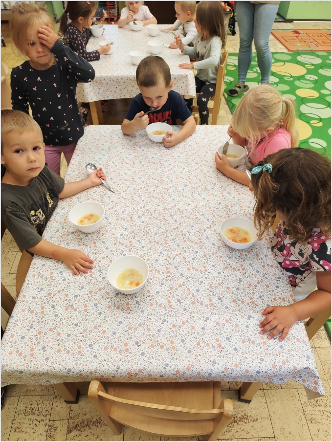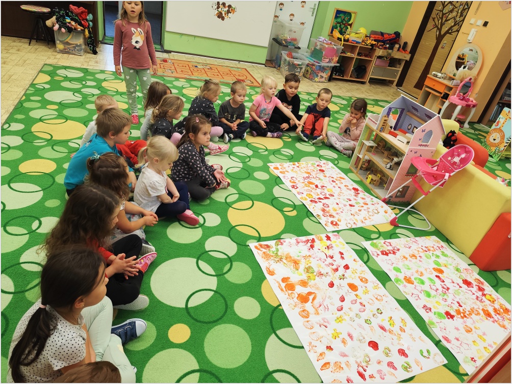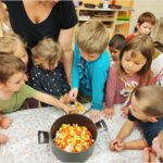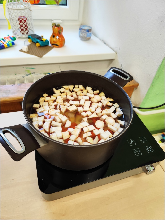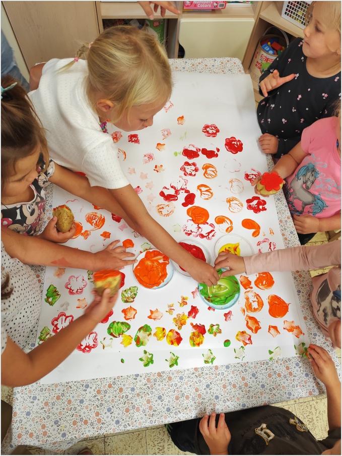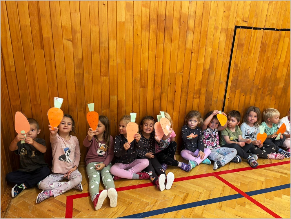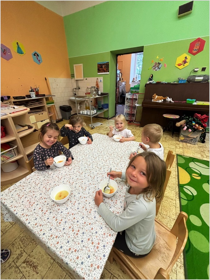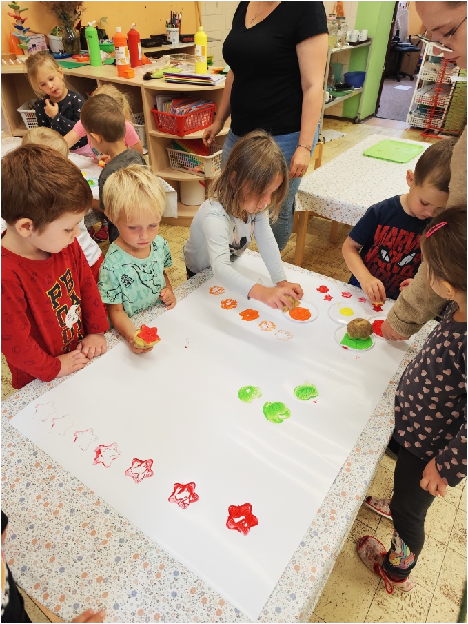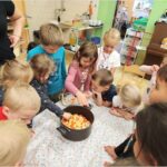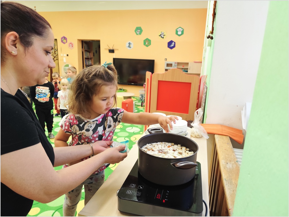 V MŠ se děti seznamovaly s podzimní zeleninou a objevovaly její barvy, tvary a vůně. Společně si ji nakrájely a uvařily z ní výbornou zeleninovou polévku. Než se polévka dovařila, tvořily děti ve skupinkách obrazy pomocí bramborových tiskátek. Zahrály si také veselé hry, při kterých si procvičily barvičky a svou obratnost. Celé dopoledne si všichni moc užili a za odměnu si pochutnali na polévce, která se jim opravdu povedla.