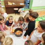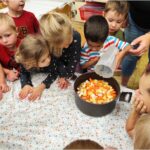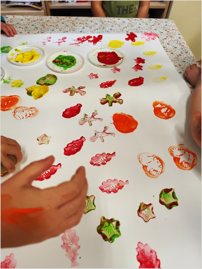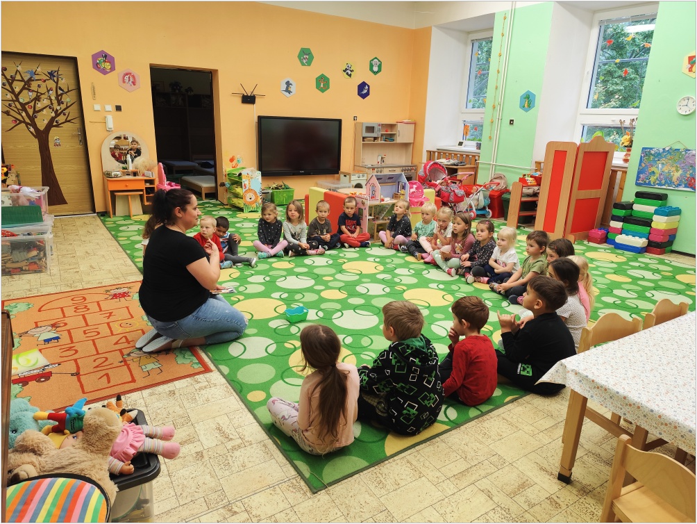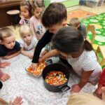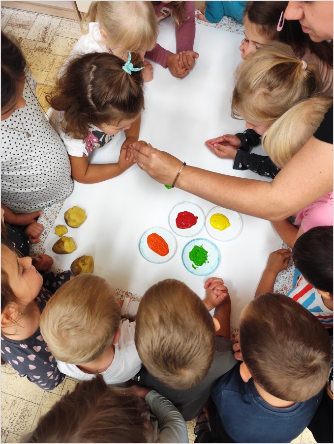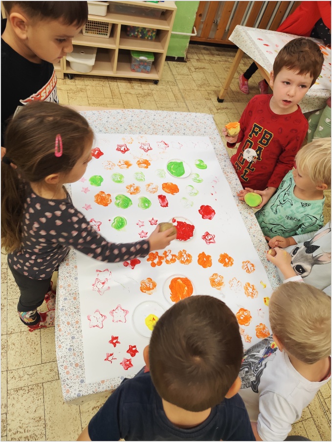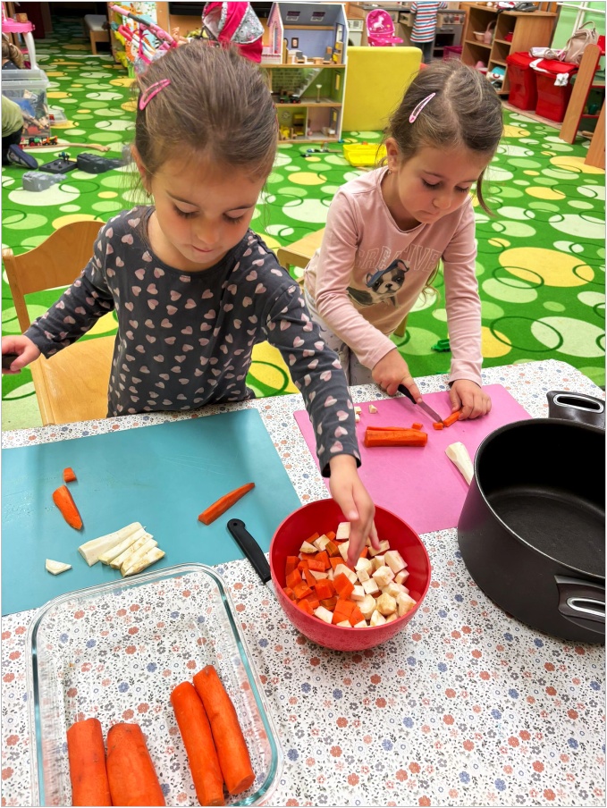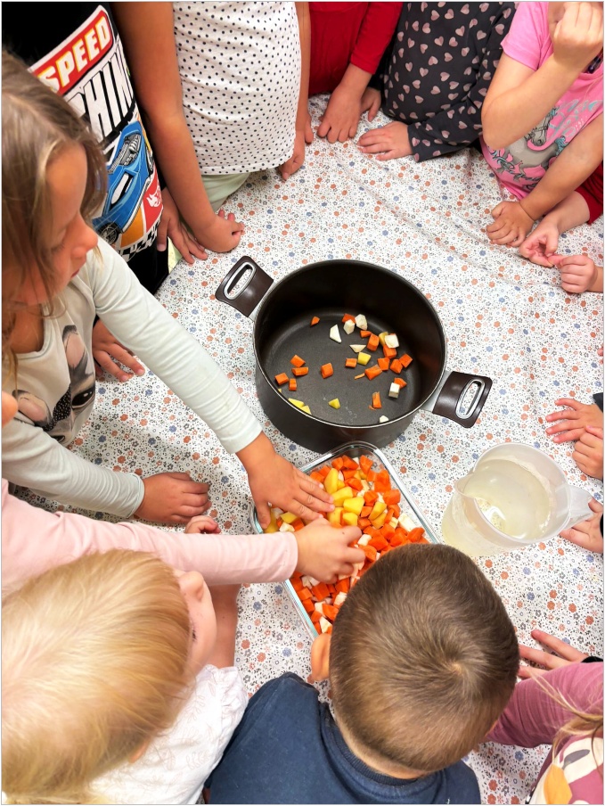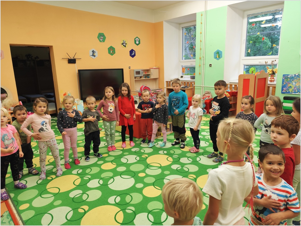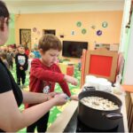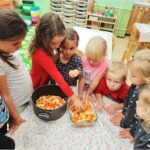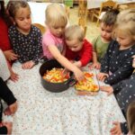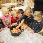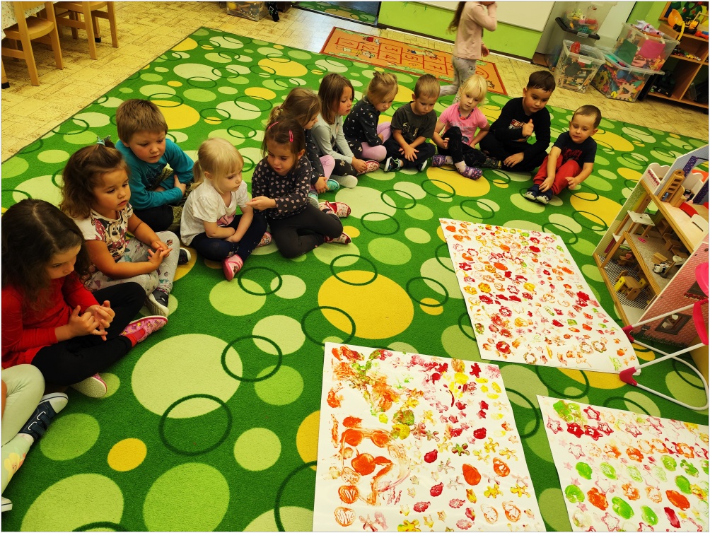V MŠ se děti seznamovaly s podzimní zeleninou a objevovaly její barvy, tvary a vůně. Společně si ji nakrájely a uvařily z ní výbornou zeleninovou polévku. Než se polévka dovařila, tvořily děti ve skupinkách obrazy pomocí bramborových tiskátek. Zahrály si také veselé hry, při kterých si procvičily barvičky a svou obratnost. Celé dopoledne si všichni moc užili a za odměnu si pochutnali na polévce, která se jim opravdu povedla.